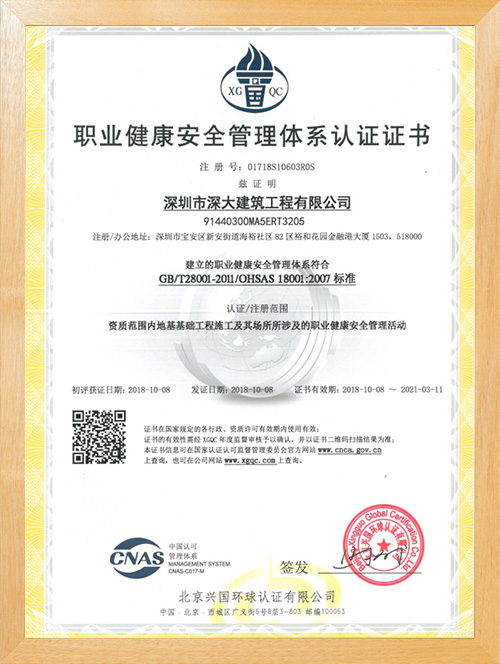 深圳市深大建筑工程有限公司,成立于2017年,注冊資本5000萬,總部位于深圳市寶安區中心地段。公司擁有地基基礎工程專業承包壹級資質,市政公用工程施工總承包二級資質,是一家一體化現代型企業。公司重視企業內部管理與發展,嚴格實施ISO管理體系,率先通過了ISO9001質量管理體系認證、環境管理體系及、職業健康安全管理體系的認證。為公司的長遠發展奠定了穩健基礎。